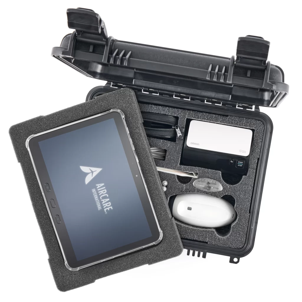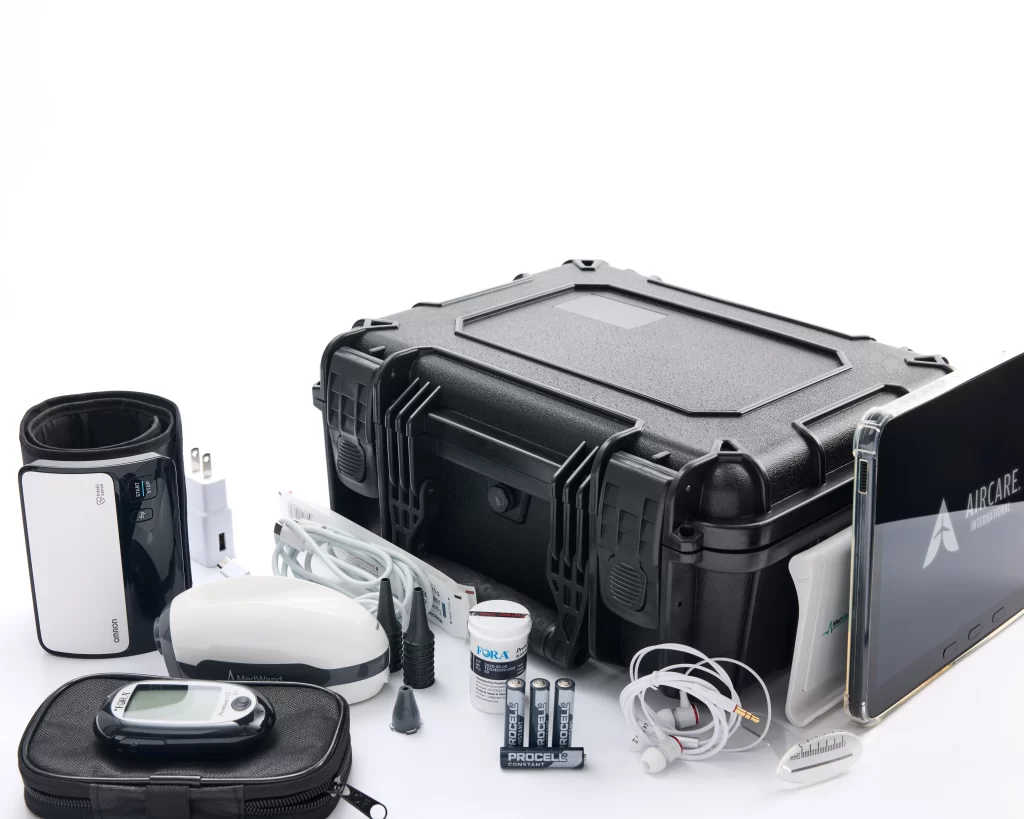 The Aircare Emergency Diagnostic Platform (AEDP) empowers flight crews and passengers by delivering high-quality patient information through encrypted video and real-time diagnostic data shared with our board-certified physicians on the ground. The device allows our care team to see and hear a patient, and monitor all of the key data used by emergency room clinicians when medical intervention is necessary. The AEDP uses a tablet-based platform and digital diagnostic equipment to livestream critical information during a medical emergency, allowing for accurate assessment and recommendations by our staff and doctors. By seamlessly integrating with Aircare’s emergency telemedicine, the Aircare Emergency Diagnostic Platform ensures reliable, secure, and effective care during time-sensitive emergency situations.